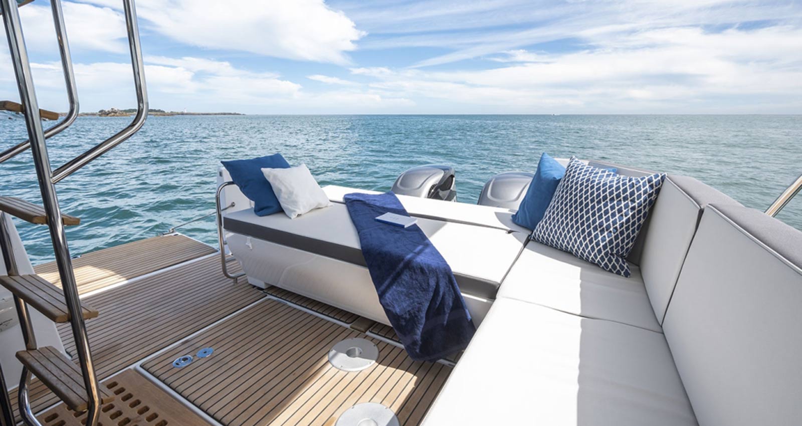 Múltiples soluciones innovadoras aportan un alto nivel de confort : banqueta-solárium popa, plataforma de baño lateral creando una terraza sobre el agua, cubierta flush y unión casi ininterrumpida entre la bañera y la timonería.