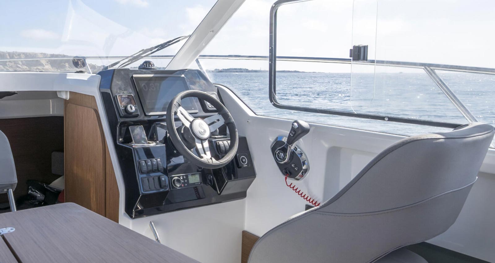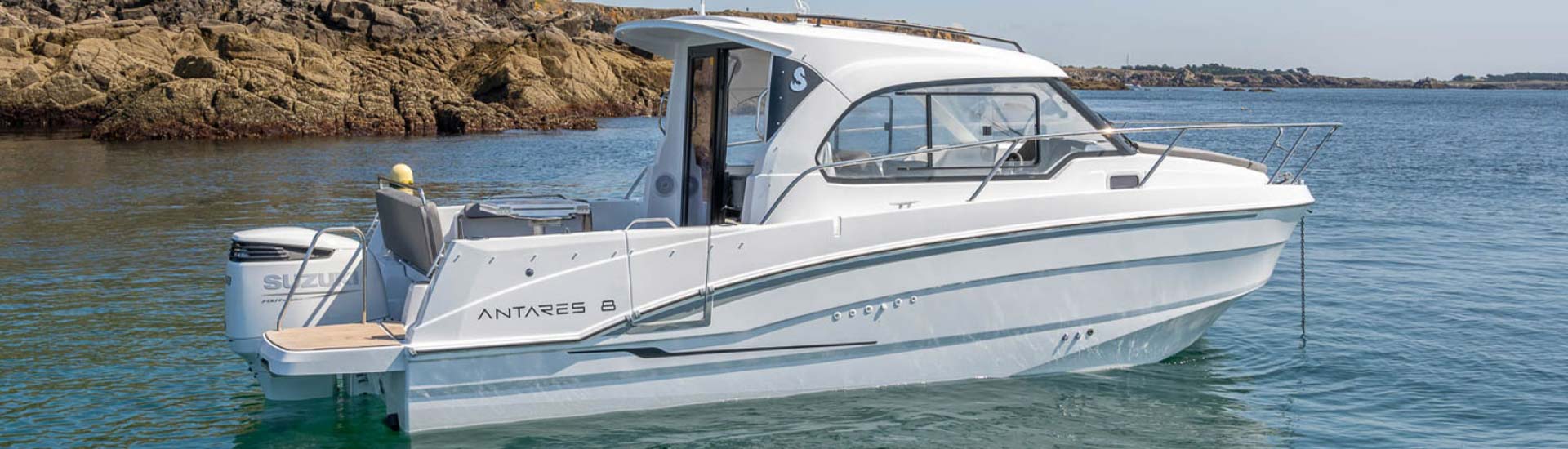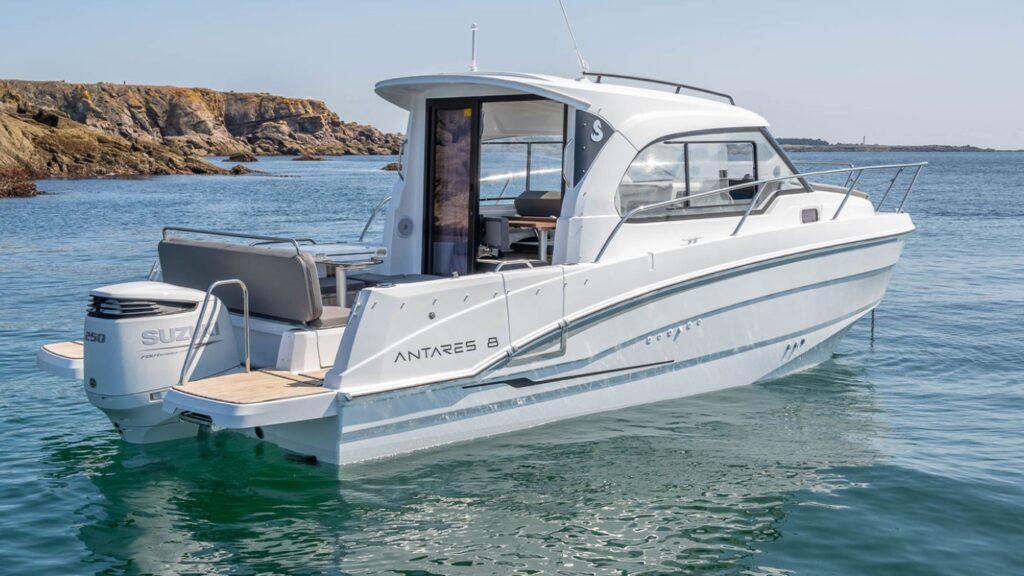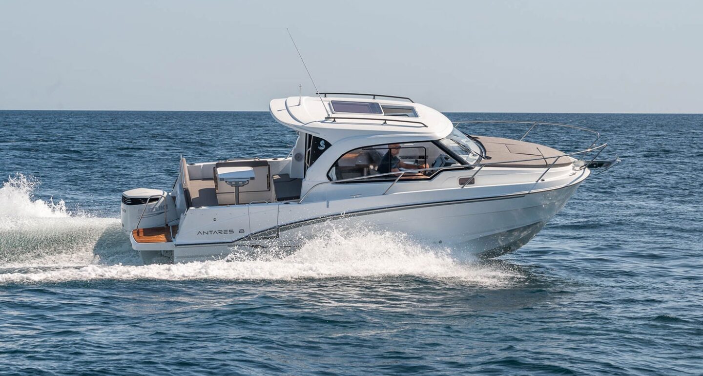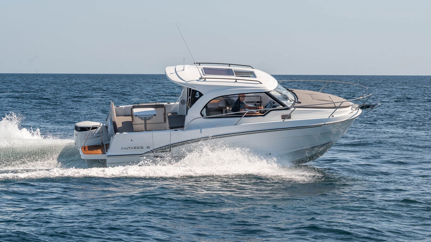 El Antares 8 retoma la carena con el diseño tulipado propio de la gama Antares, que le confiere una excelente estabilidad en todas las condiciones. Por su lado el puesto de gobierno ergonómico e integrado adopta una pantalla de control de 12 pulgadas opcional. Propulsado por un motor de 250 caballos, el Antares 8 puede conseguir los 35 nudos.
