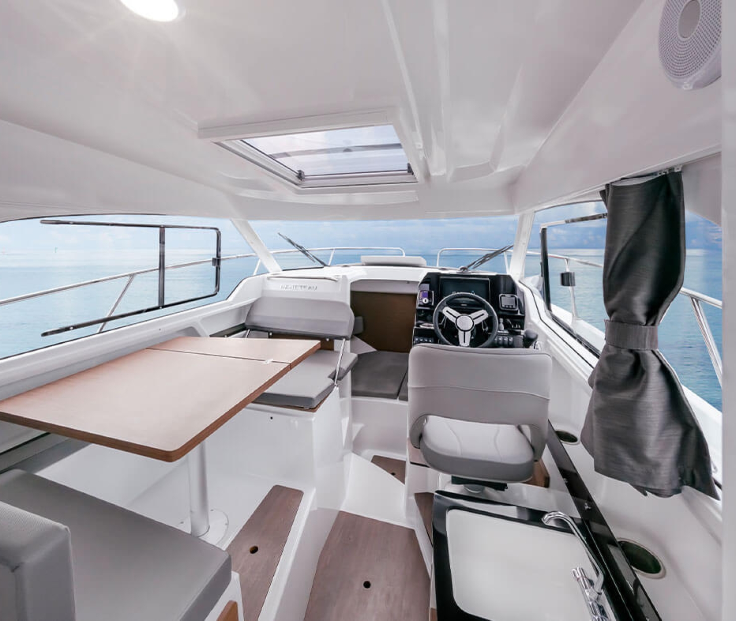 En la popa, la cabina modular garantiza un confort óptimo para la tripulación. Los bancos del salón pueden utilizarse como una gran zona para tomar el sol, gracias a la nueva mesa extraíble, o para acomodar a todos los pasajeros durante una comida.