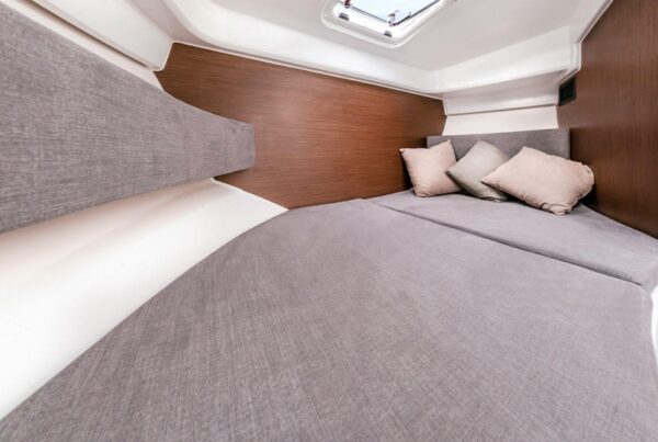 Pueden pasar la noche a bordo hasta cinco pasajeros, gracias a las dos literas dobles, una en el camarote y la otra en la timonería. Una litera suplementaria puede también ser instalada en el espacio situado bajo el salón.