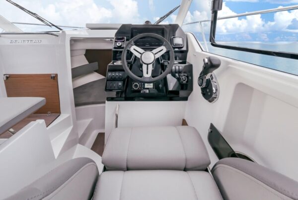 El salón modulable garantiza un espacio óptimo y facilita los desplazamientos de la tripulación gracias a las banquetas plegables. Una vez las banquetas desplegadas y la mesa movible instalada, el Antares 8 Fishing ofrece un salón confortable para momentos de amistosa convivencia.