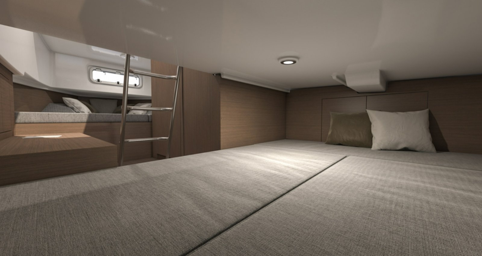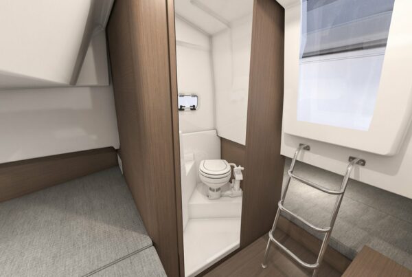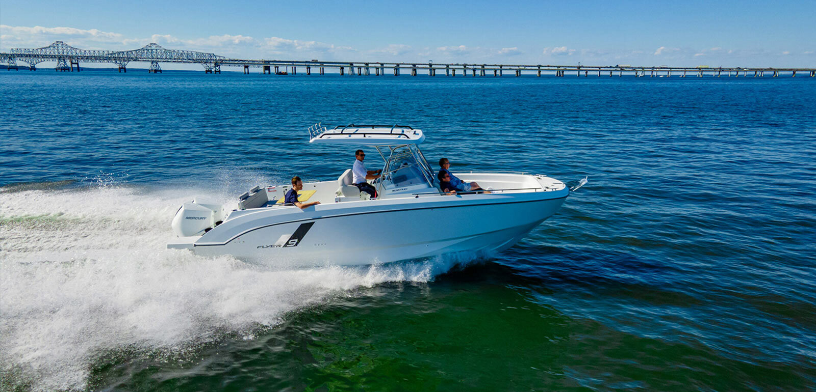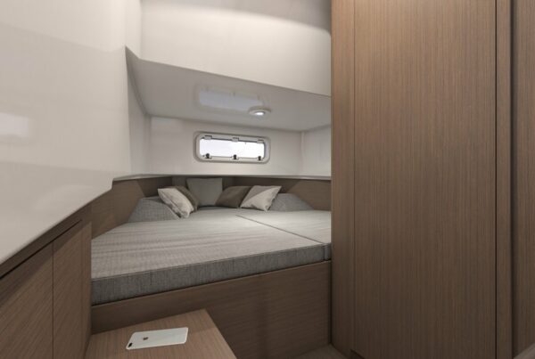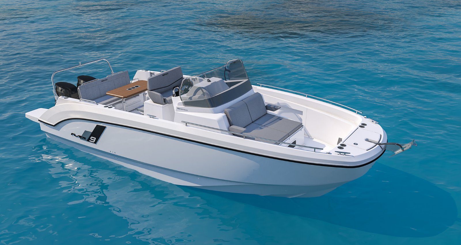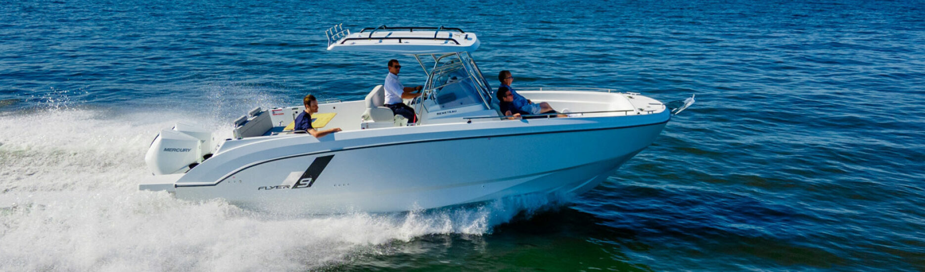 Así, una verdadera « terraza » con visión sobre el mar y acceso privilegiado para el baño, la plataforma lateral a babor constituye una de las novedades más importantes del Flyer 9.