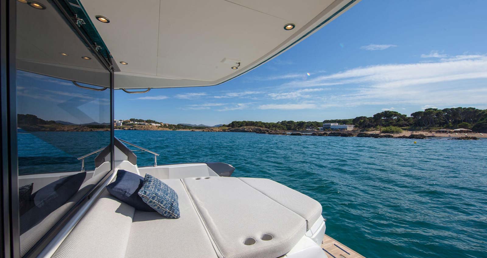 Gracias al hard-top dotado de un techo abrible eléctrico de serie (en cristal, opcional) y la posibilidad de una cristalera escamoteable para cerrar la popa de la bañera, el GT 45 favorece la abertura a los elementos naturales siendo protector cuando las condiciones lo exigen.