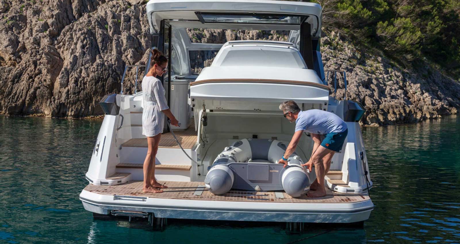 La inmensa plataforma de baño hidráulica incita a los placeres náuticos. Lúdica pero también práctica, el GT 45 dispone de un ingenioso garaje para el anexo disimulado bajo el solárium de popa. Se revelará rápidamente indispensable gracias a su torno y a su dispositivo de abertura eléctrica y podrá ser convertido en espacio de estiba.