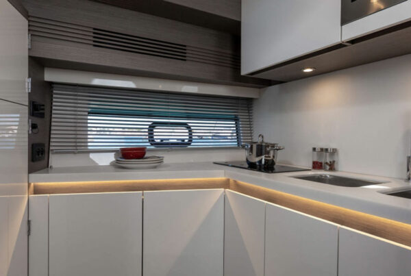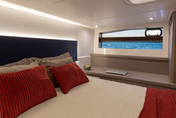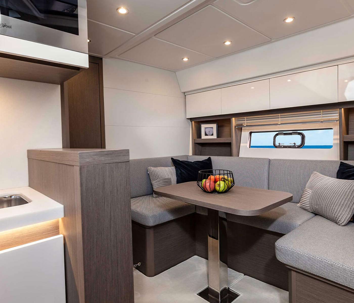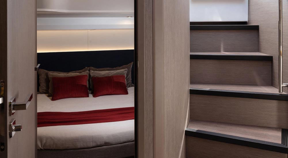 En la cubierta inferior, todo el confort está previsto para prolongar la escapada al mar : un muy bello camarote armador a popa con su aseo independiente, un camarote de invitados a proa con un segundo aseo, un salón amistoso y una gran cocina equipada. La atmósfera elegante y cálida ofrecida por la madera de nogal gris caracteriza la nueva generación de Express-Cruisers.