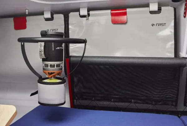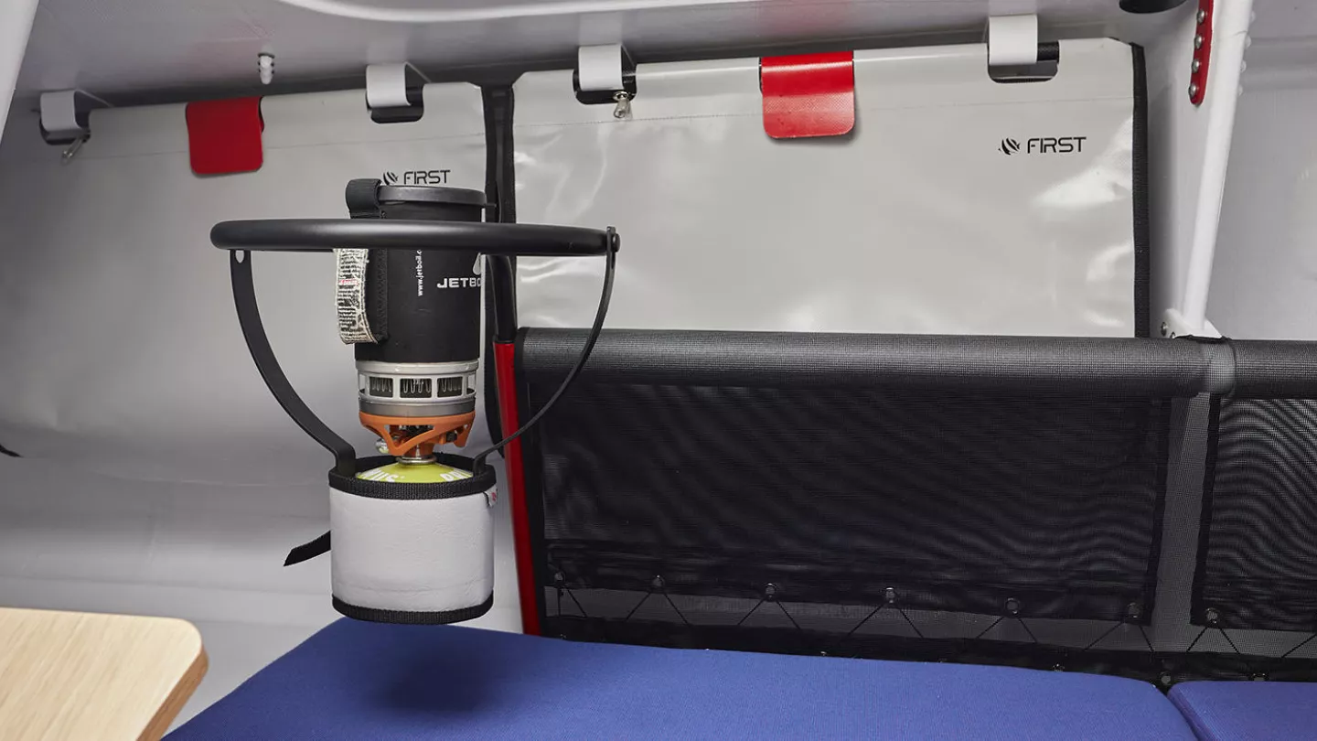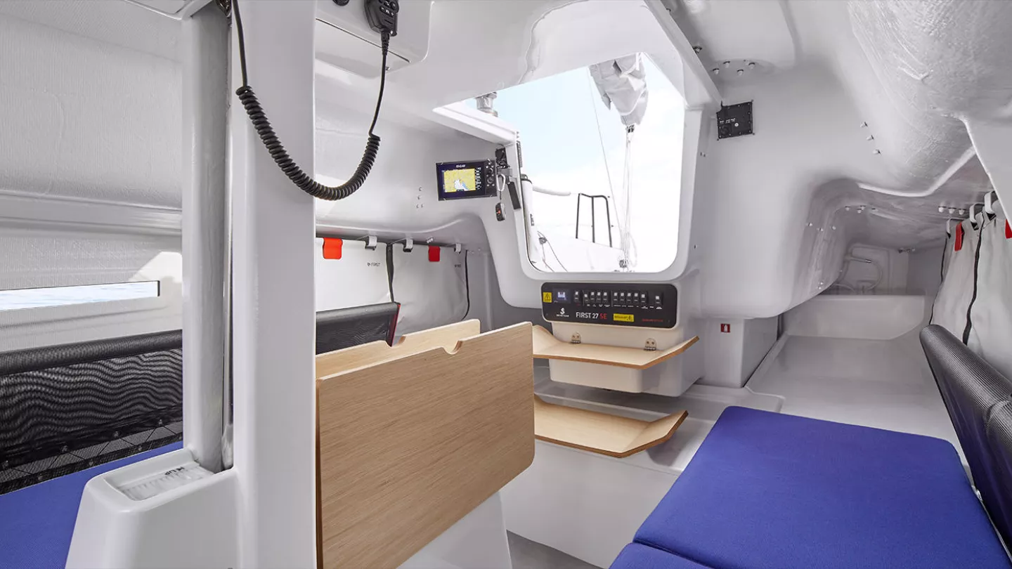 El First 27 SE es único en el mercado : es el único barco transportable homologado en categoría B que ofrece un interior equipado. A pesar de su look minimalista, acoge 6 adultos a bordo, 2 en los camarotes de proa y 4 en las literas del salón.