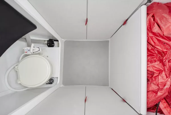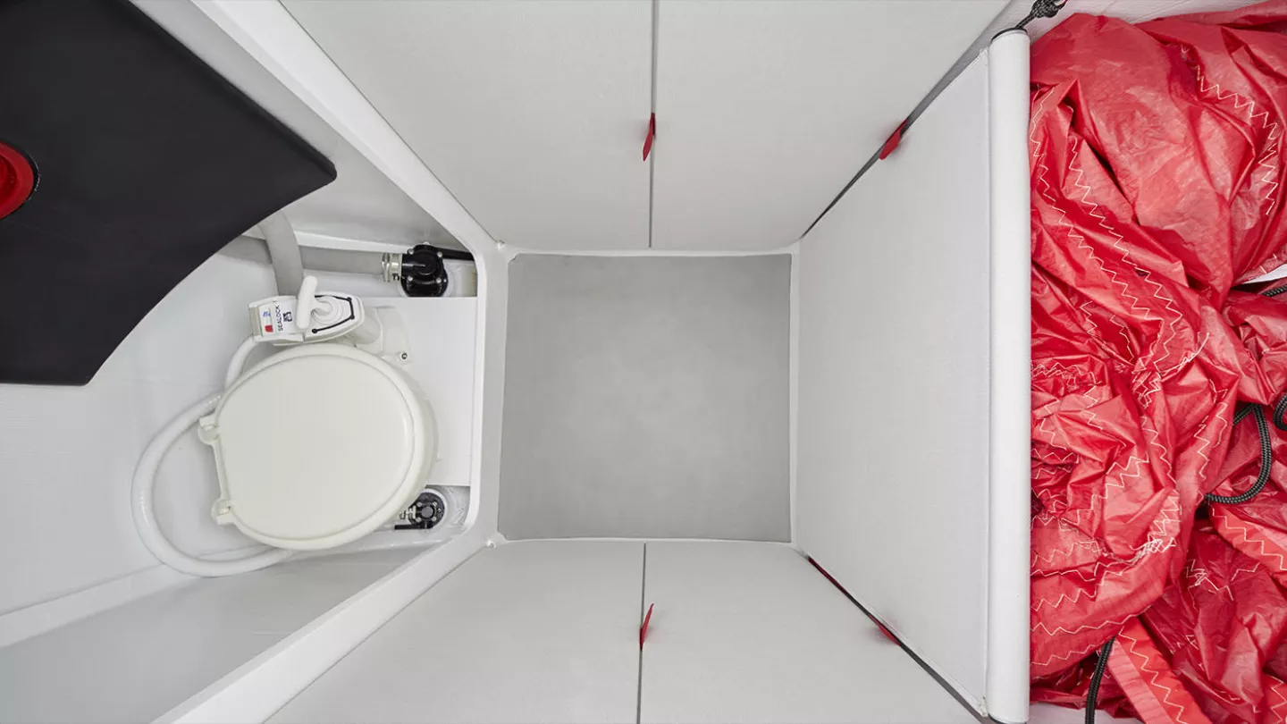 Las innovantes puertas magnéticas situadas en la parte central, permiten ya sea aislar el camarote de proa o cerrar el WC o el pañol de velas.