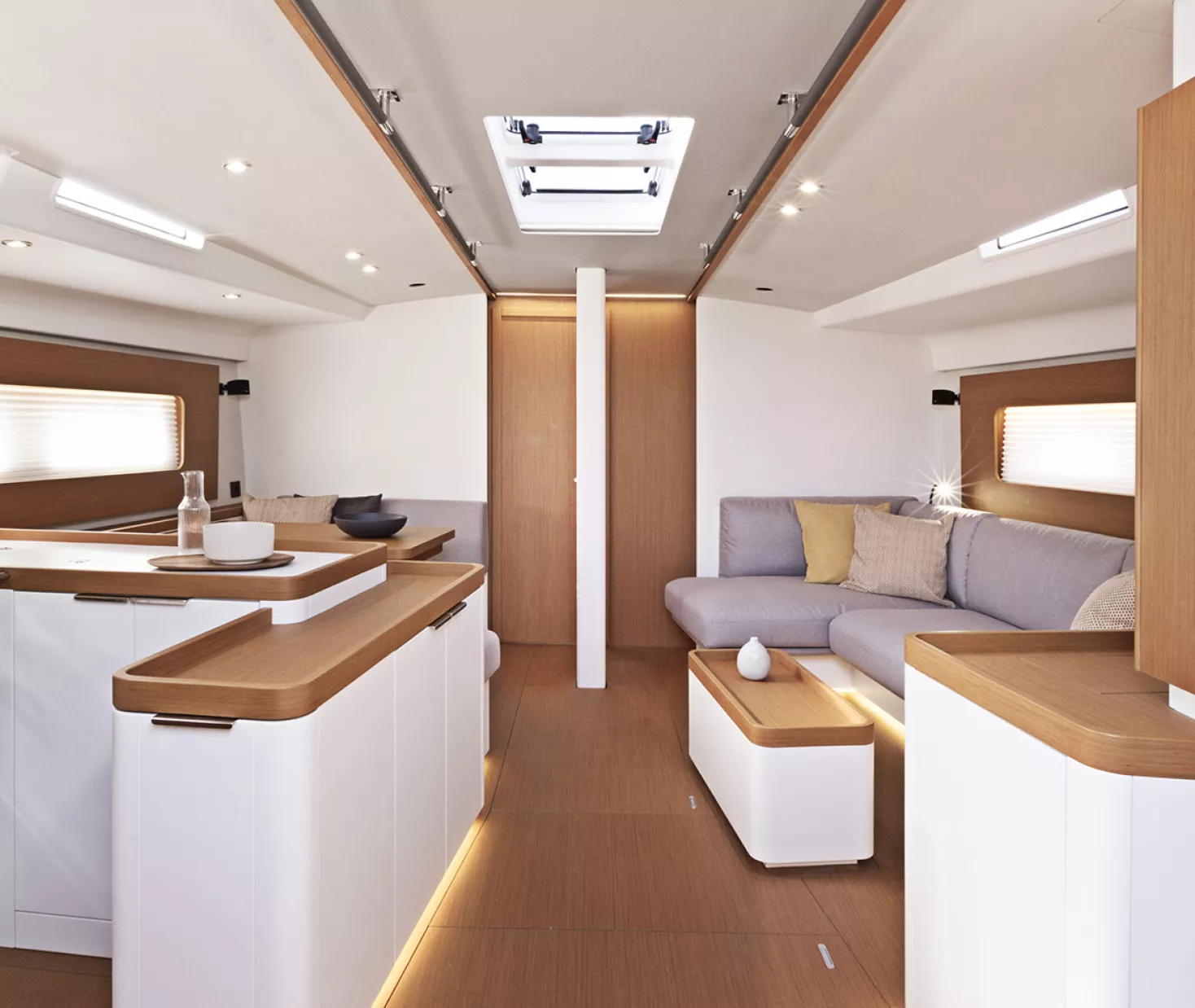 Es el gran retorno de la madera moldeada, material noble con acabados repulidos, sobre fondo de mamparos lacados y suelo en teca para el espacio interior del First 53 que no se ve demasiado extremo en su modernidad. Regalas y pasamanos, estibas completas componen el interior dotado de tres camarotes dobles y dos aseos La innovación mayor de este interior reside en el rincón salón/descanso, dotado de un sofá con mesa baja, separado del espacio cocina equipado con una mesa para cenar. El conjunto es luminoso, aireado y comunica fácilmente con el exterior por un descenso fácil e intuitivo.