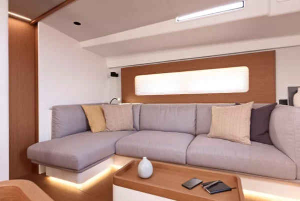 El interior del First 53 innova con este gran sofá y su mesa baja. Para responder a la demanda de la nueva forma de navegar, mesa de salón más grande, pero dos espacios bien distintos y más prácticos de usar : el espacio de descanso y el espacio de comer.