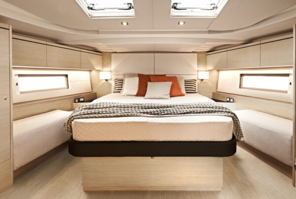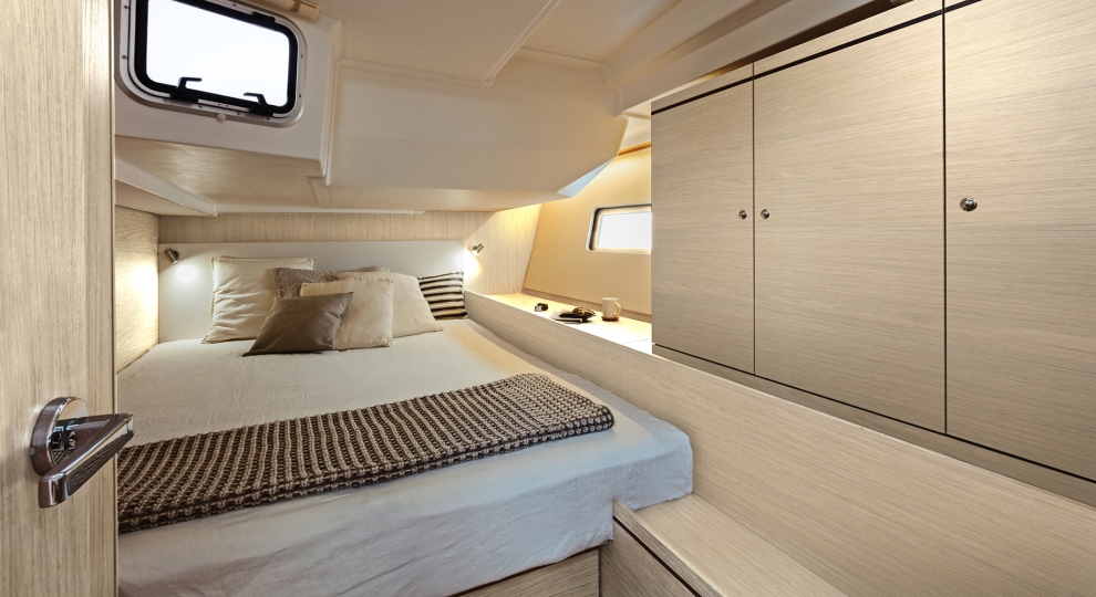 Además de la estética interesante de su forma tulipada, esta nueva carena libera volúmenes interiores que permiten configuraciones inéditas en este tamaño de barco. Acentuando las líneas suaves del crucero, la cubierta procura una holgura de desplazamiento apreciable y segura. La espaciosa bañera, el nombre y la implantación de los espacios de descanso,